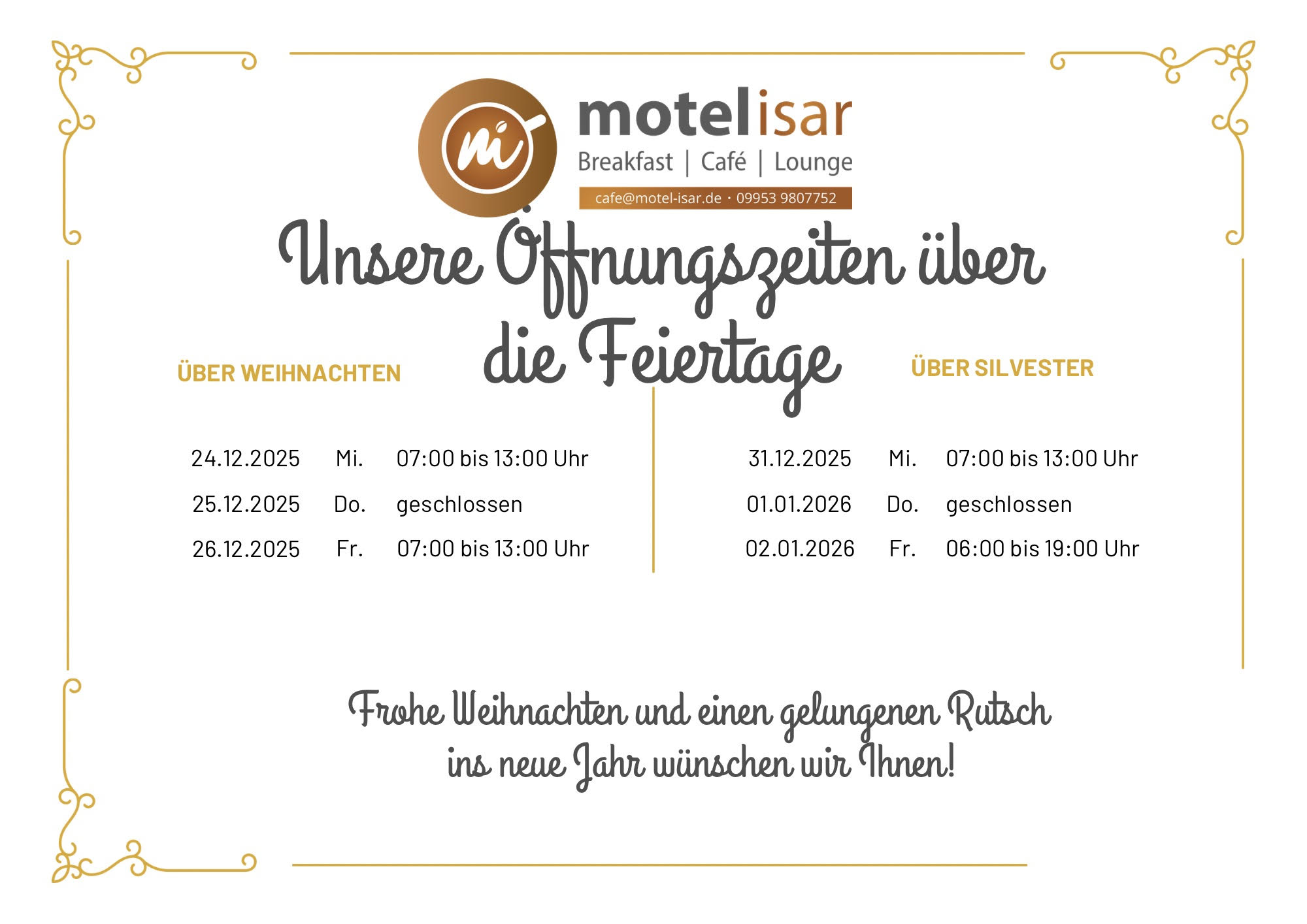Wir erwarten Sie an 7 Tagen in der Woche. Montags ab 6 Uhr und am Wochenende ab 7 Uhr. Ein abwechslungsreiches Frühstück versüßt Ihnen den Start in den Tag. Frisches Obst, Joghurt, ofenfrische Backwaren, mit viel Liebe zubereitet - das erwartet Sie im Motel Isar Café.